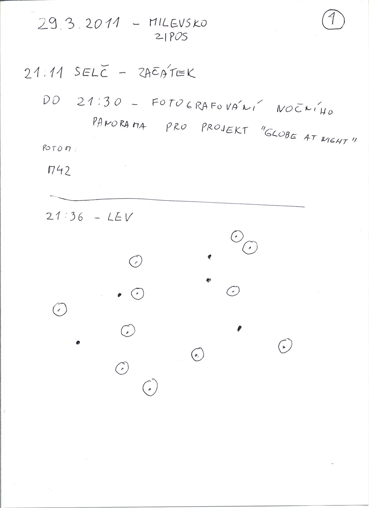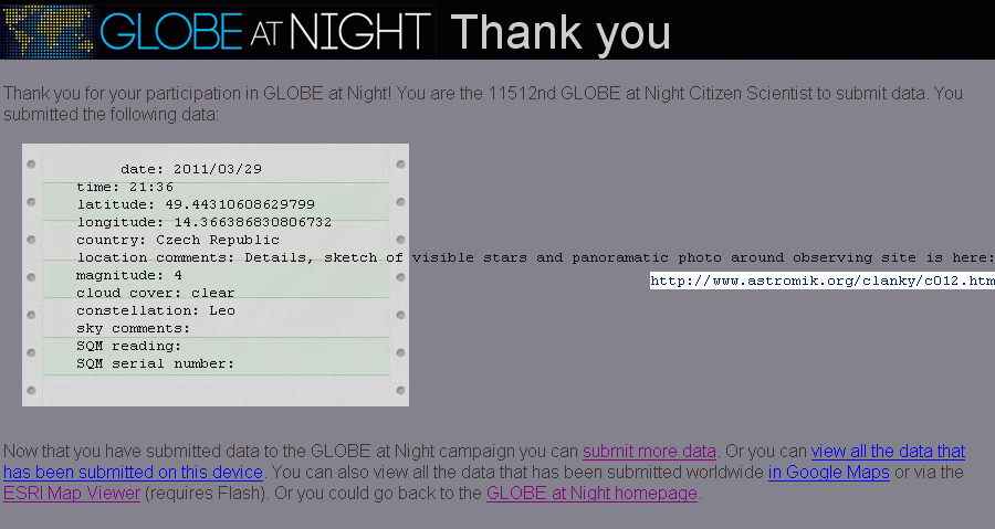 29.3.2011 večer (ve 21:36 SELČ) jsem se zapojil do projektu Globe at Night. Tento rok se určovalo světelné znečištění pomocí počítání hvězd v souhvězdí Lva. Bližší informace v češtině k tomuto projektu jsou třeba tady: http://www.astro.cz/clanek/4610