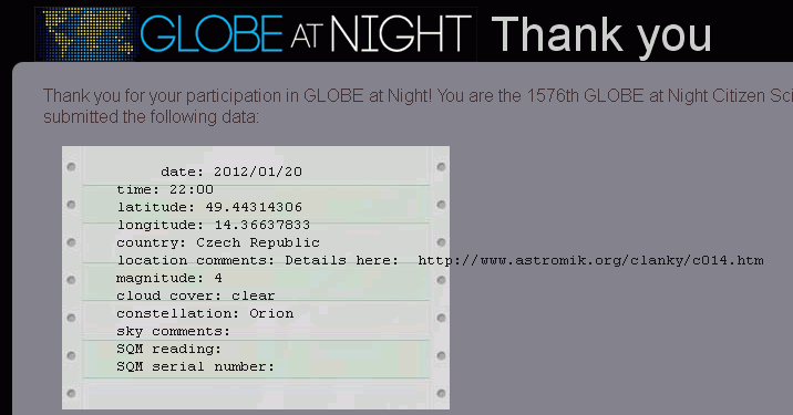 20.1.2012 večer (ve 22:00 SEČ) jsem se zapojil do projektu Globe at Night. V tomto termínu se určovalo světelné znečištění pomocí počítání hvězd v souhvězdí Orion. Bližší informace v češtině k tomuto projektu jsou třeba tady: http://www.astro.cz/clanek/5000