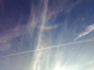 dotykovým obloukem), ale s tím si nejsem jistý. Světlá čára, která je skoro kolmá k okraji střechy je kondenzační stopa od letadla. Slunce bylo v té době asi 25° nad horizontem.