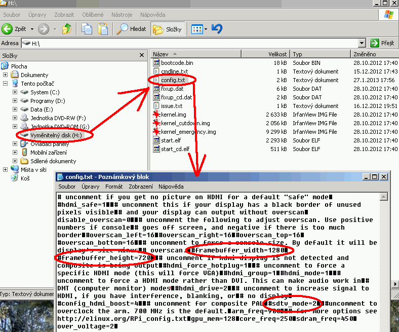 Tím se formát "vysílání" obrazu změní z původního NTSC na PAL. Doplnění 27.1.2013 Soubor config.txt je možné editovat i na PC se systémem Windows. Stačí paměťovou kartu z raspíčka strčit do čtečky a připojit k PC. V průzkumníku je potom možné soubor na kartě vyhledat a pomocí Poznámkového bloku příslušné parametry upravit. Protože Windows používá jiné kódy pro konce řádek než Linux, je ten