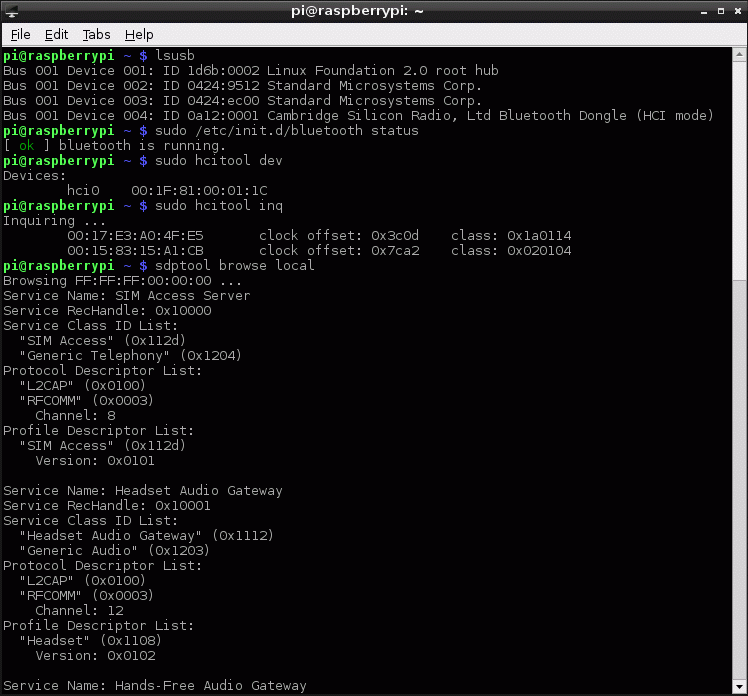 Pak jsem zapnul bluetooth na PDAčku a na PC. Nastavil jsem těmto zařízením stav na "zjistitelný". Potom jsem zadal několik příkazů k otestování, jestli je BT adaptér správně nainstalovaný: