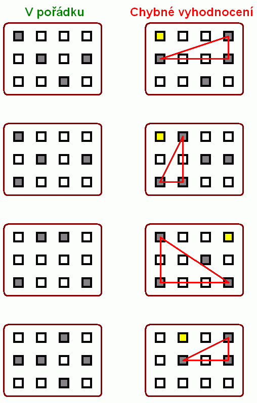 případech dojít k chybě při vyhodnocení. K tomuto chybnému vyhodnocení dochází tehdy, když některá ze stisknutých tlačítek tvoří pravoúhlý trojúhelník, jehož odvěsny kopírují směr řádek a sloupců. V tom případě počítač vyhodnotí, že je stisknuto ještě další tlačítko, které jakoby doplňuje pravoúhlý trojúhelník na obdélník, nebo čtverec. Tady je několik příkladů: