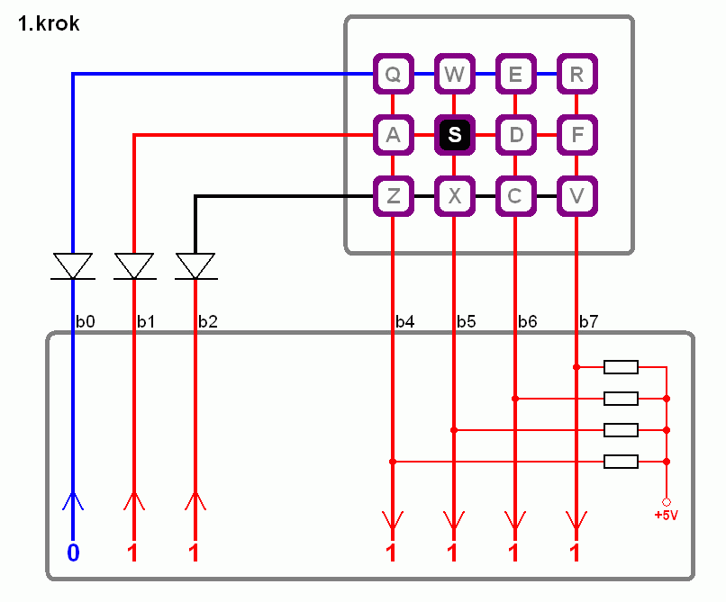 stisknuté současně. V prvním kroku se logická "0" z horního řádku přes sepnutou klávesu "R" přenese na sloupec "b7". Ve druhém kroku se "0" z prostředního řádku přenese přes sepnutou klávesu "S" na sloupec "b5". V posledním kroku se "0" nikam nepřenese, protože ve spodní řádce není stisknutá žádná klávesa.