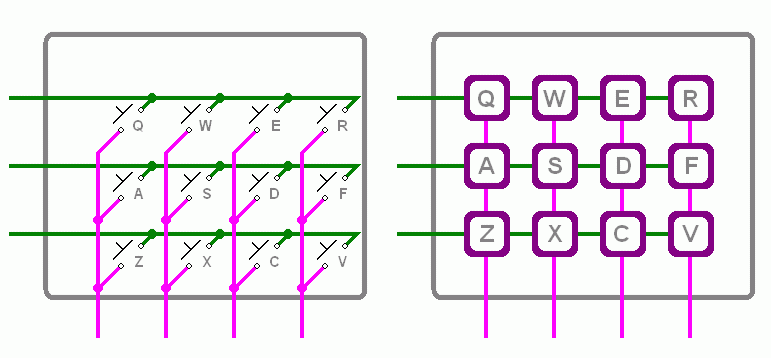 Princip spočívá v tom, že se nečte stav celé klávesnice najednou,