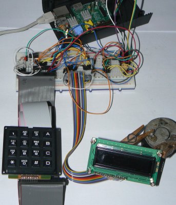 Základem je GPIO expander MCP23017. Jeho port "GPA" se stará o řízení displeje. Displej je k expanderu připojený "úsporným" (čtyřdrátovým) způsobem (má zapojené pouze 4 datové vstupy). To umožňuje využít zbylé GPA piny pro řídící signály (Strobe - E, RegistrySelect - RS a podsvět - A). Jeden pin (GPA7) dokonce zbyl a je možné ho využít pro další vstup (například tlačítko) , nebo výstup (třeba LED). Druhá polovina expanderu (GPB) se stará o čtení maticové klávesnice 4x4 znaky.