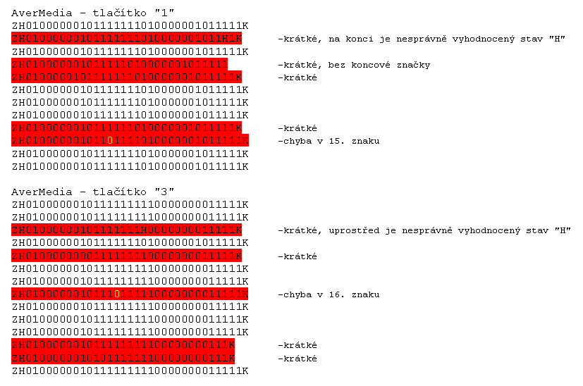 Z toho se dá usuzovat, že správný kód pro tlačítko "1" je "ZH01000000101111111010000001011111K"